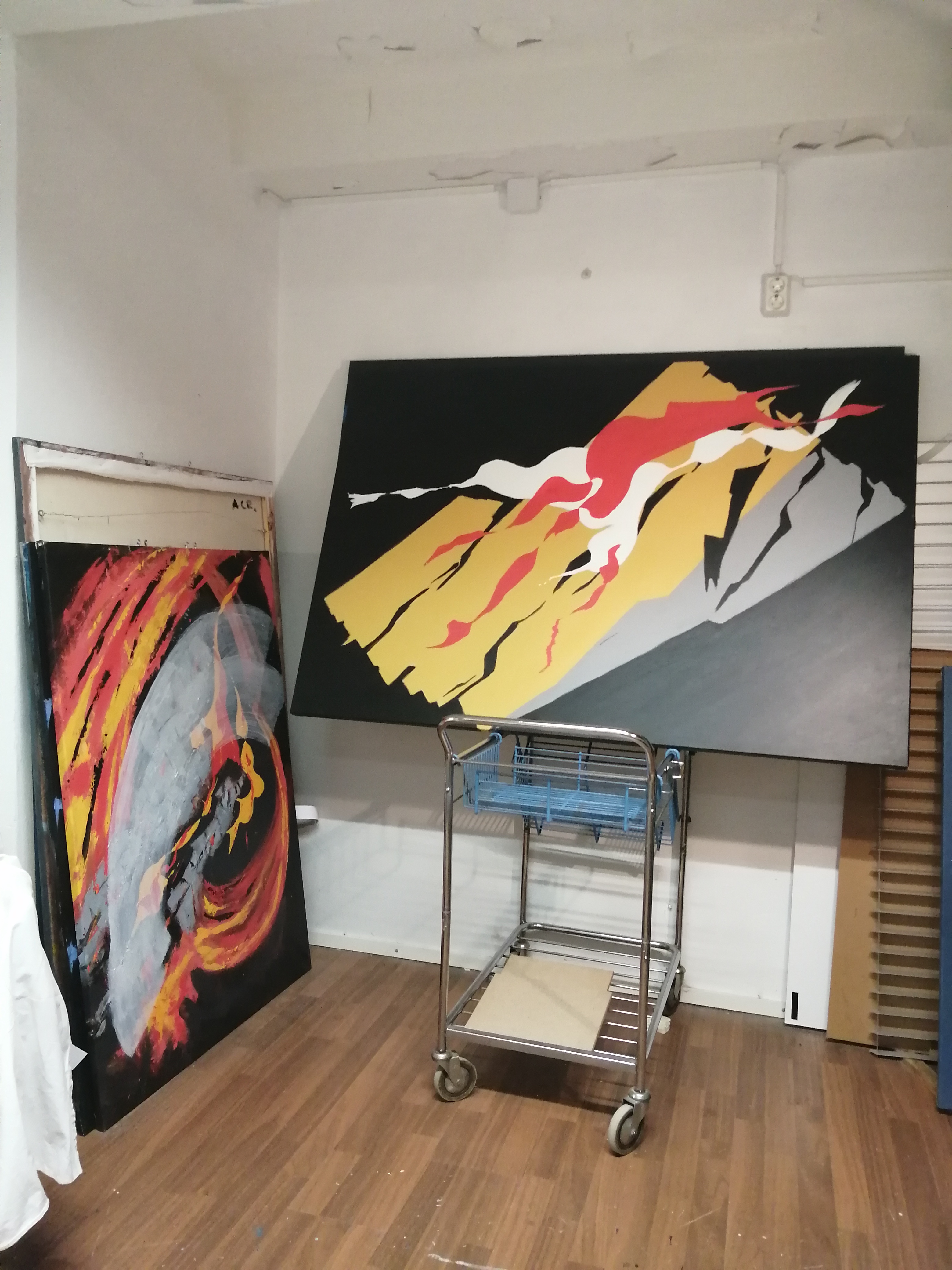 Pari seinäveistosta 8.5.2022 päättyneestä näyttelystä.